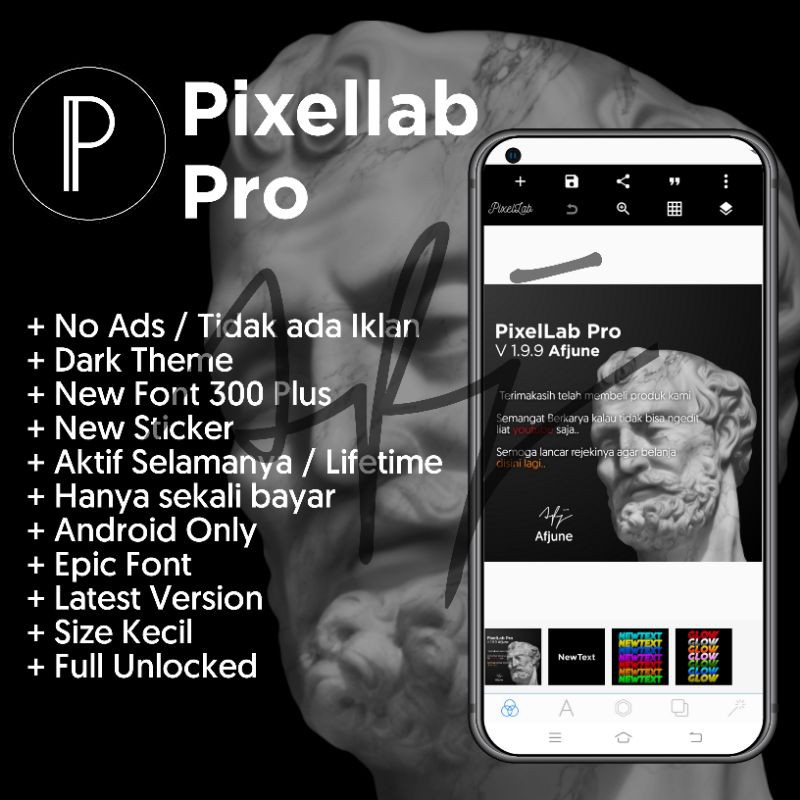 WAJIB BACA DESKRIPSIProduk akan kami kirimkan via EMAIL, jangan lupa cantumkan EMAIL anda di chat atau di catatan pembeli saat melakukan pemesanan.Fitur Pixellab Pro- No Ads / Tidak Ada Iklan- Dark Theme - New Font- New Sticker- Aktif Selamanya - Full Unlocked- Hanya Sekali Bayar- Android Only- Size Kecil- Epic Font- Latest Version Setelah 5 jam status produk dikirim segera klik Pesanan Diterima, jangan lupa berikan reputasi yang positif serta garansi 100% kami berikan.TTD A