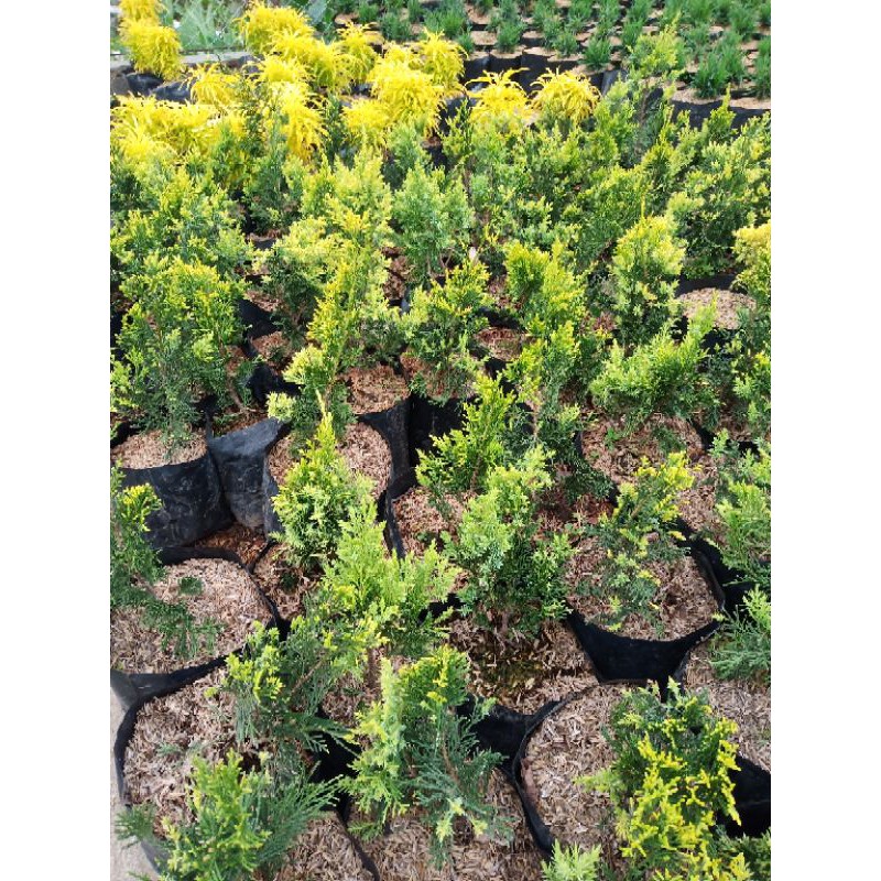 cemara viking daun berwarna hijau,pucuk berwarna kuning cocok untuk teras maupun ou