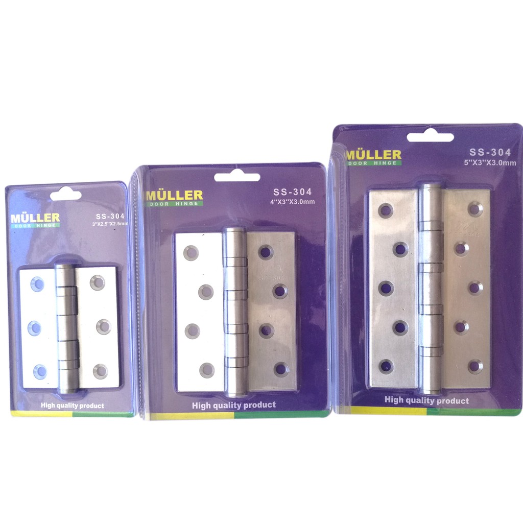 Engsel Pintu Merk MullerUkuran 3 - 5 inchiBahan : Stainless SUS 304Harga 1 pasang (2pcs)Lengkap dengan sekrup pemasa